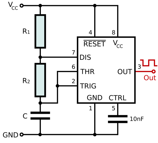 Frequenzbestimmend sind C, R1 und R2. Der 10 nF Kondensator an Pin 5 dient nur der Stabilität der Schaltung und soll unkontrollierte Schwingungen verhindern. Der Reset würde durch Ground am Resetpin 4 ausgelöst. Deshalb wird dieser fest mit + verbunden.